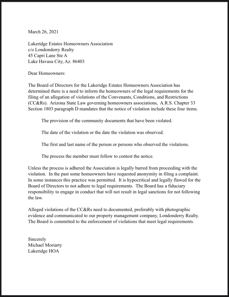 If you would like to report a violation, please review the information needed to do so here, and submit the information to our Property Management Company, Londonderry Realty.
